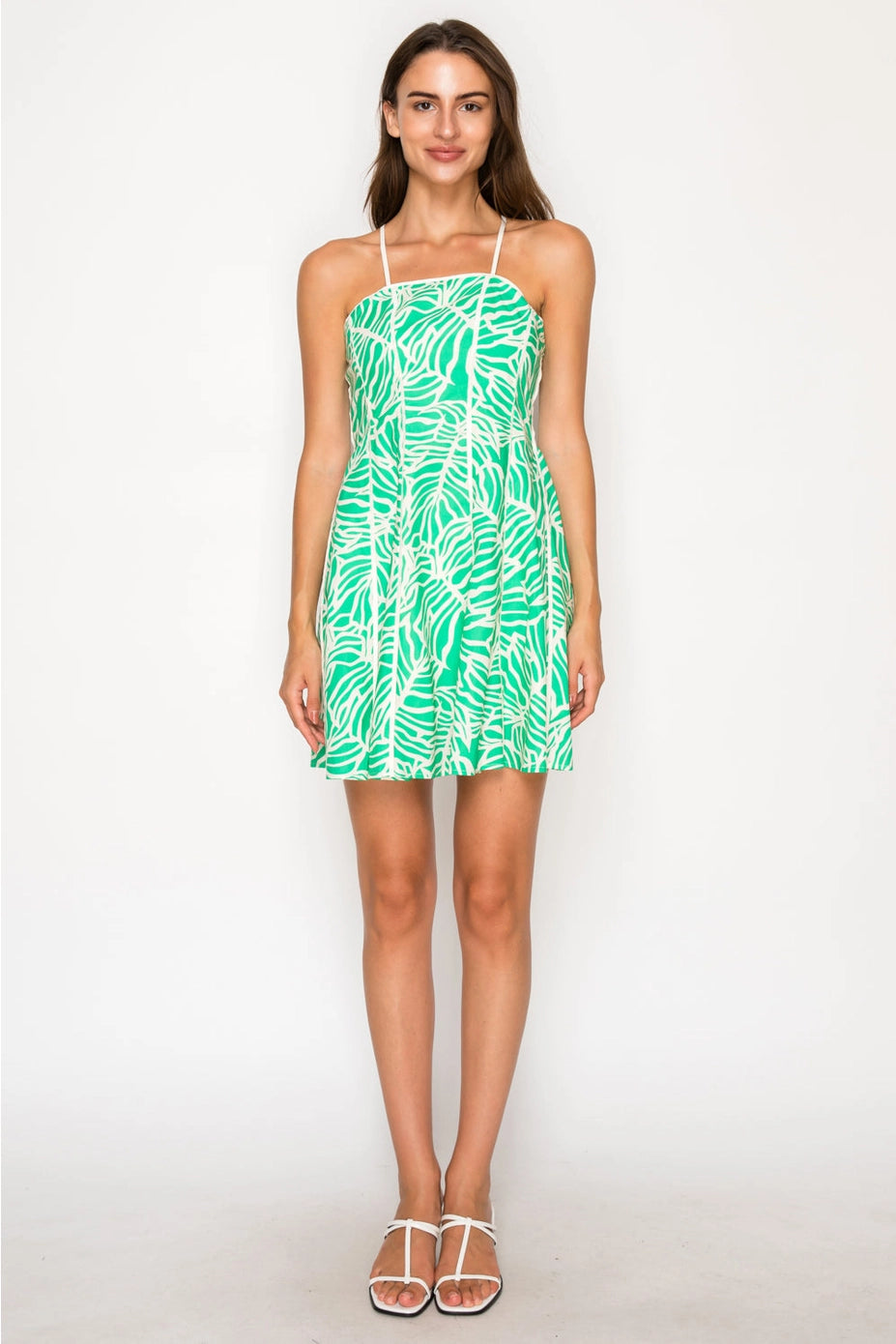 Awaken your inner island muse with the Verde Palms Mini Dress, a vision of vibrant energy and effortless grace. This stunning piece is inspired by the lush, sun-drenched greenery that frames the azure Aegean Sea, perfect for a day of sun-seeking and island exploration. Feel the spirit of an endless summer in this breathtaking palm print mini dress. The striking white and emerald green botanical pattern mirrors the vibrant flora of the Greek isles, while the elegant straight neckline and delicate adjustable straps create a clean, modern silhouette. Crafted with a flattering fit-and-flare design, this dress moves beautifully as you wander through winding village paths or enjoy a seaside lunch. It’s the ultimate, easy-to-wear piece that promises pure, captivating romance. Details * Vibrant white and emerald green palm botanical print * Elegant straight neckline for a clean, modern look * Delicate, adjustable spaghetti straps for a bespoke fit * Flattering fit-and-flare silhouette that moves with you * Lightweight, breathable fabric perfect for tropical climates