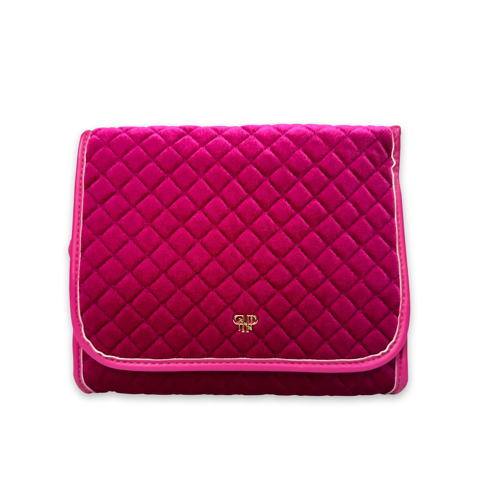 Our Fuchsia Velvet is a beautiful way to add sophistication to your organization. Our classic Hanging Toiletry Case is perfect for travel - keep your toiletries secure and beautifully organized. With the top folding hanger, your items are easily visible and accessible, no matter where your travels take you. All pockets have a clear view design, allowing you to effortlessly admire your essentials without the need to unzip. Additionally, the bottom pocket includes a removable zipper pouch for added storage capacity.