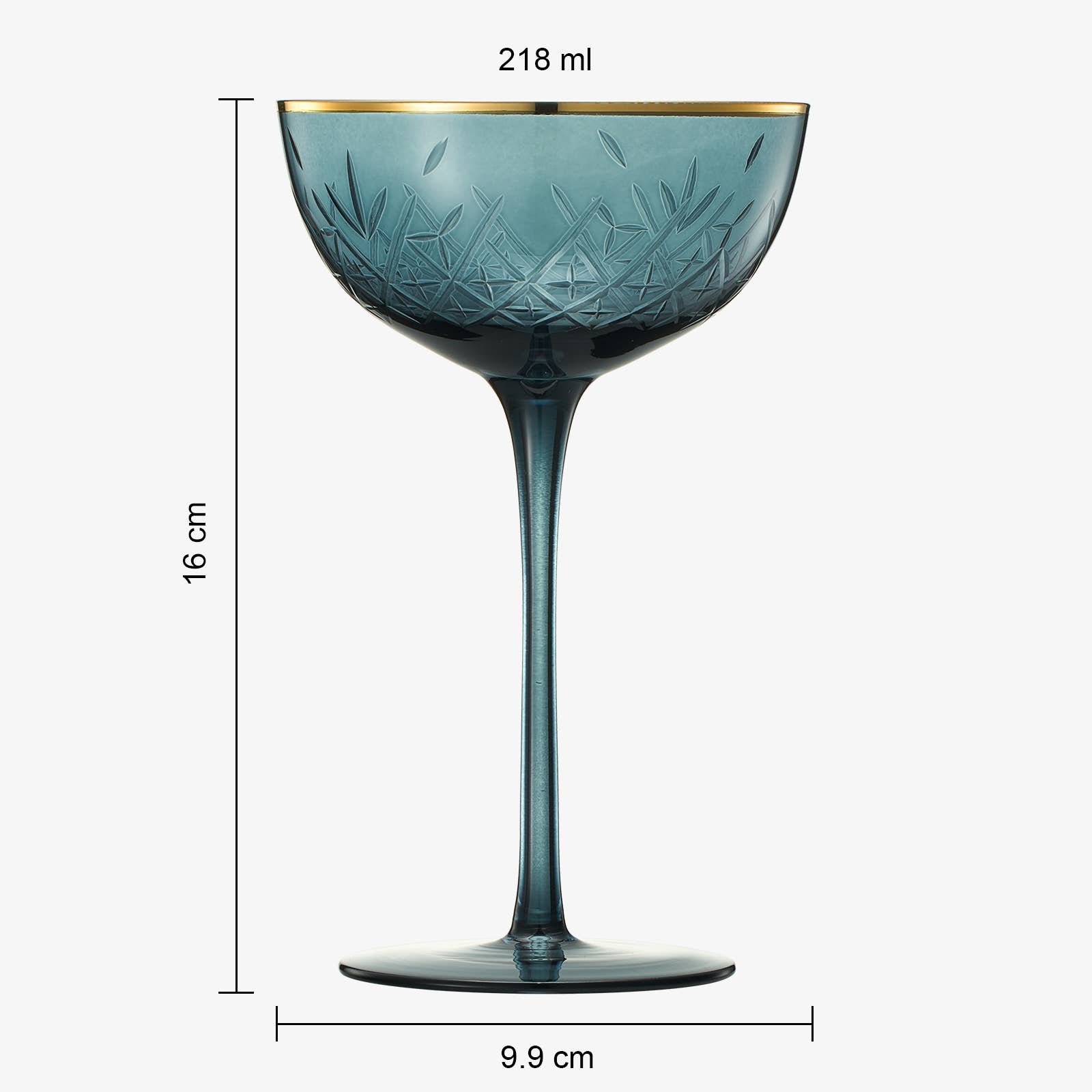 * Offering a unique hand blown Italian style, these coupe champagne glasses are a stunning accent at any table. A collection of six brilliantly colored hand blown Coupe Glasses. These glasses are both stylish and practical for serving Martini's, champagne or cocktails. The attractive gold rim around each glass is not only an attractive design element, but also adds a bit of sophistication to any table setting. * Whether you are entertaining or just serving your favorite cocktails, these gorgeous hand-blown glassware pieces make every occasion more special. This charming set of six glasses will infuse any gathering with an elevated sense of sophistication and grace.