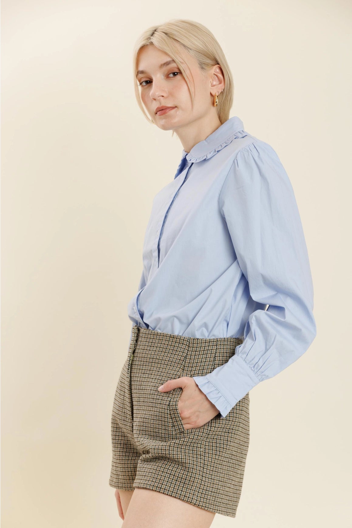-Fabrication: Non-stretch cotton poplin -Ruffled collar -Shirting with button down closure -Ruffled sleeve ends Model is 5'9" and is wearing a size Small